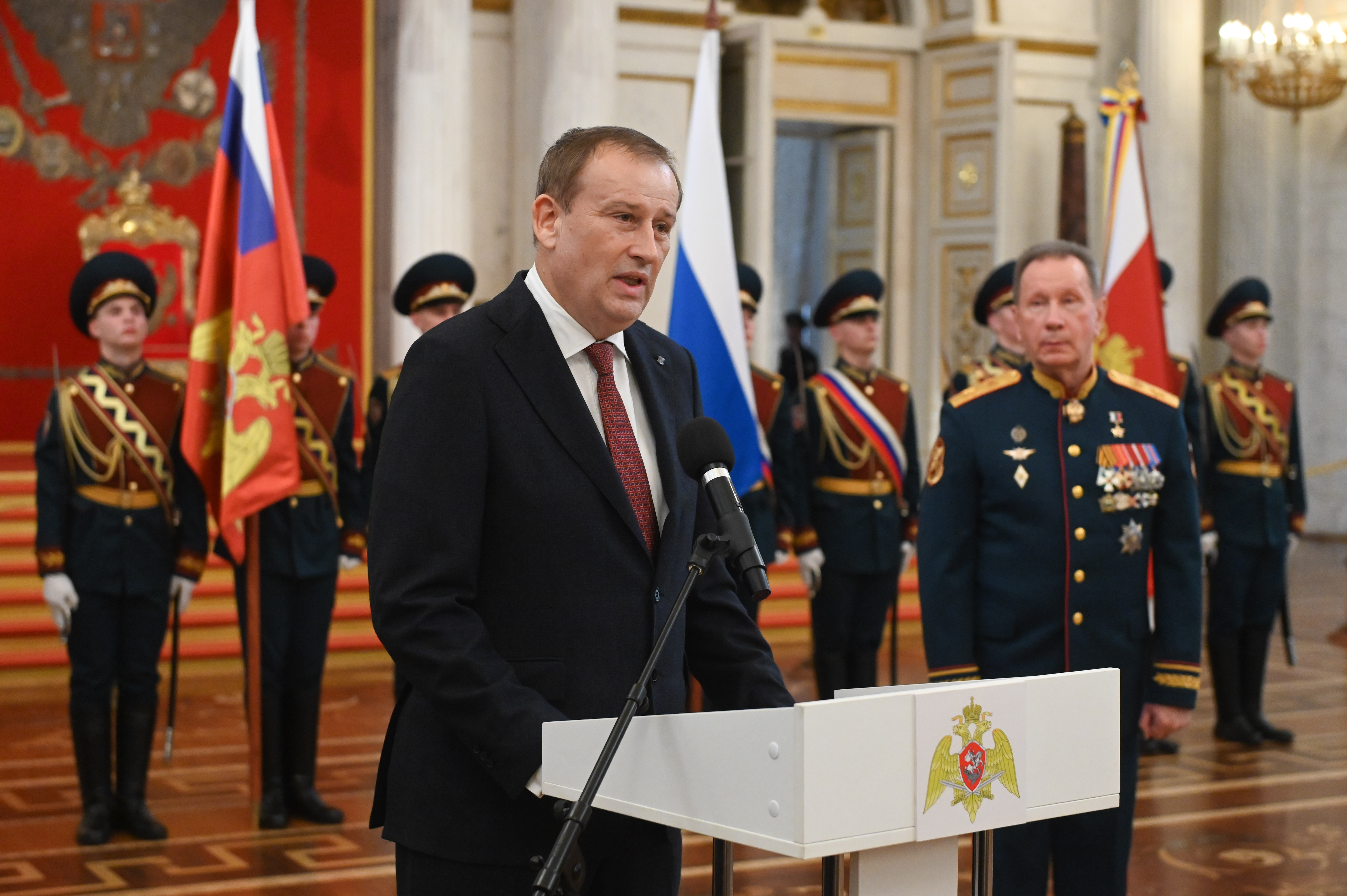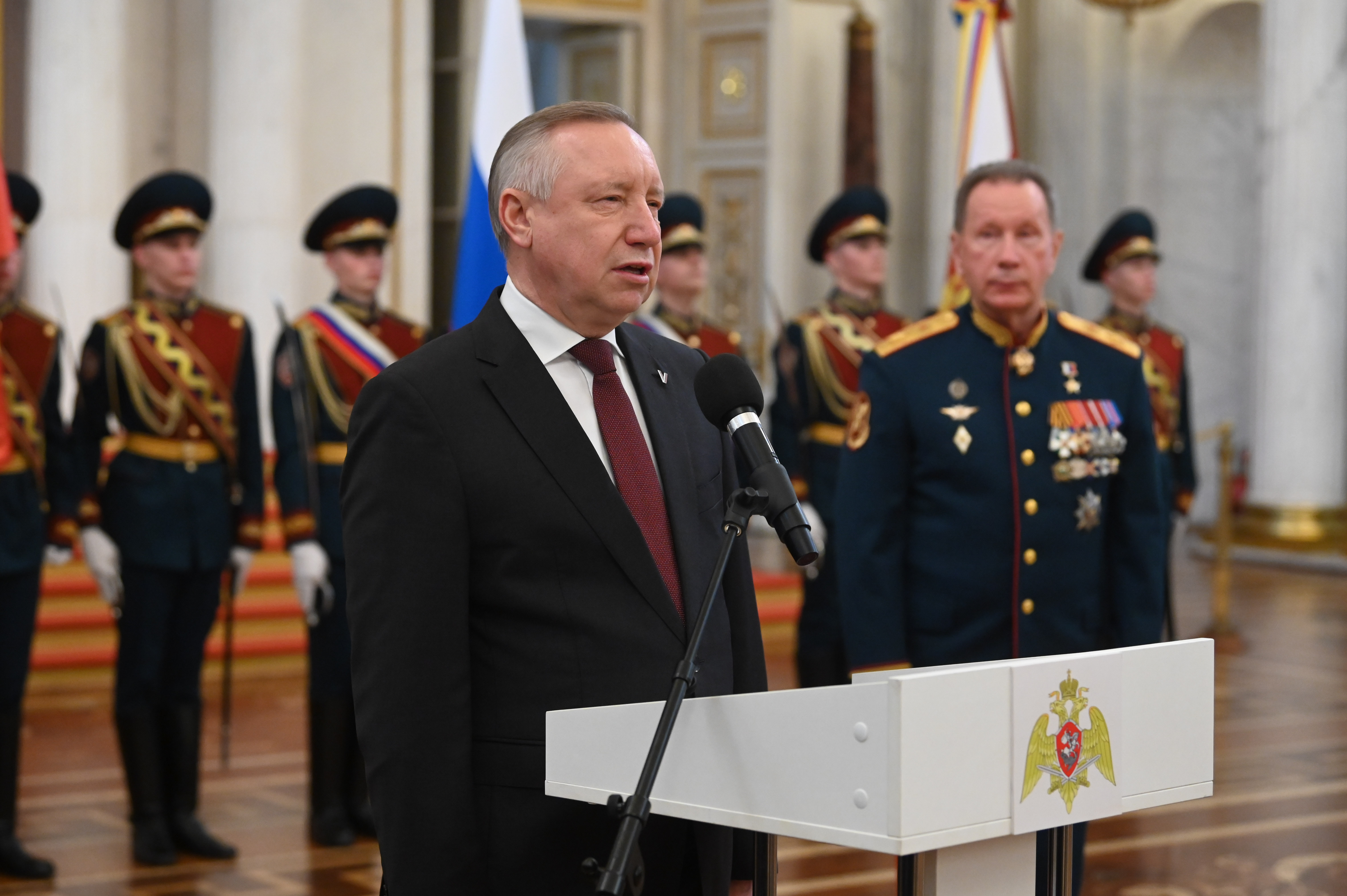 Орден Жукова к боевому знамени округа прикрепил директор Федеральной службы войск национальной гвардии РФ, Главнокомандующий войсками национальной гвардии Виктор Золотов. В своем выступлении он подчеркнул глубокий исторический символизм церемонии, ведь именно в Зимнем дворце более двухсот лет назад император Александр I принял решение о создании внутренней стражи, которая стала прообразом нынешней Росгвардии.