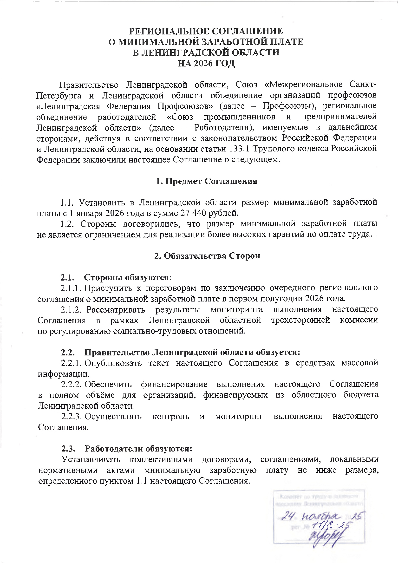 Соглашение в установленном порядке уведомительно зарегистрировано в комитете по труду и занятости населения Ленинградской области (регистрационный № 11/С-25 от 24 ноября 2025 года) и размещено на официальном портале Администрации Ленинградской области (www.lenobl.ru.ru) и официальном сайте комитета по труду и занятости населения Ленинградской области (www.ktzn.lenobl.ru).